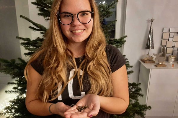 Amelie Mainz (Bild) und ihre Mutter Christiane wunderten sich, als am 13. Dezember 2021 plötzlich ein Feuersalamander in Ihrer Küche in der 2. Etage erschien.