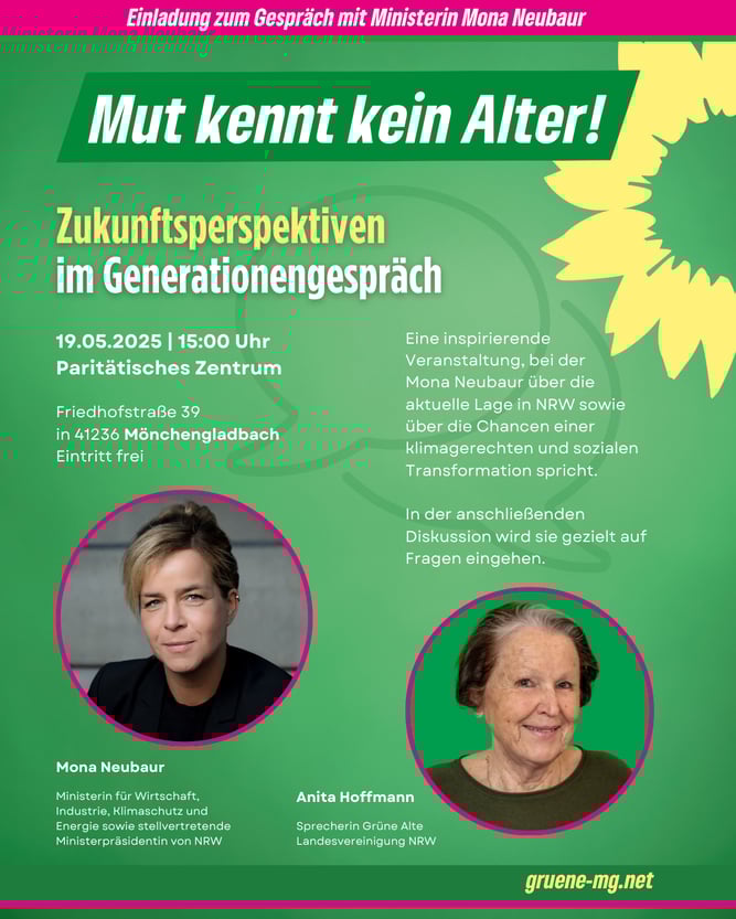 Eine inspirierende Veranstaltung, bei der Mona Neubaur über die aktuelle Lage in NRW sowie über die Chancen einer klimagerechten und sozialen Transformation spricht.