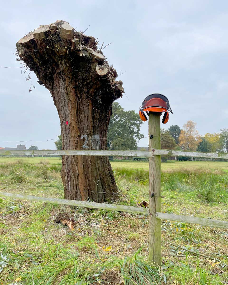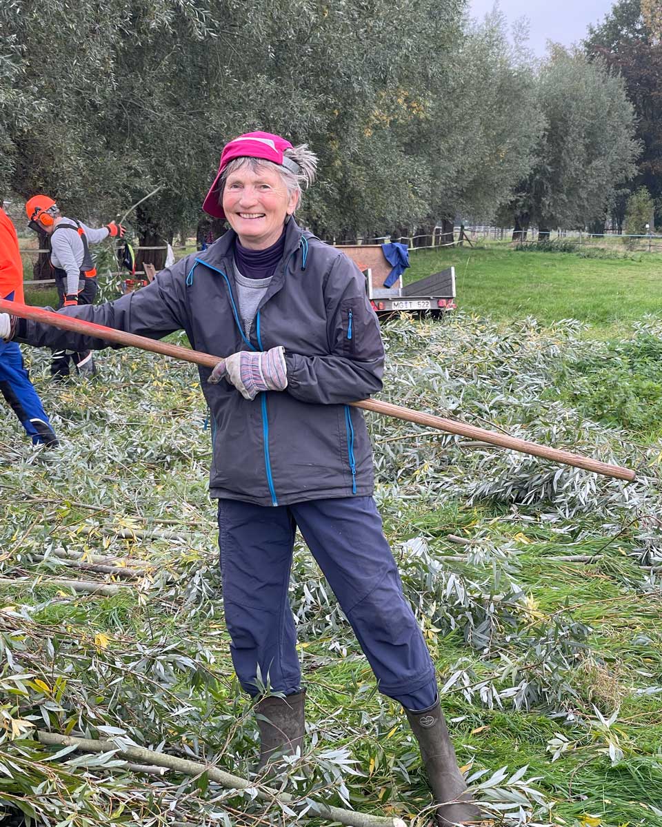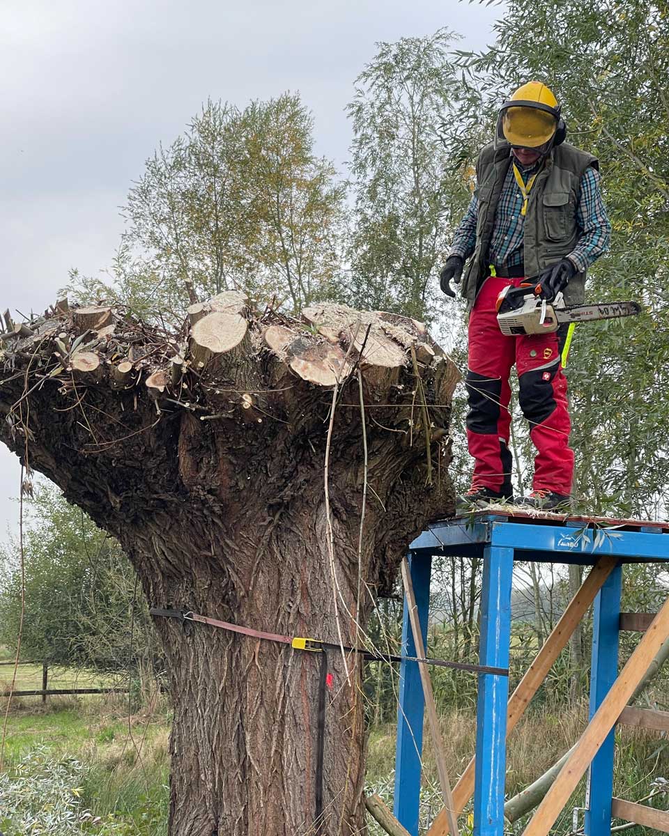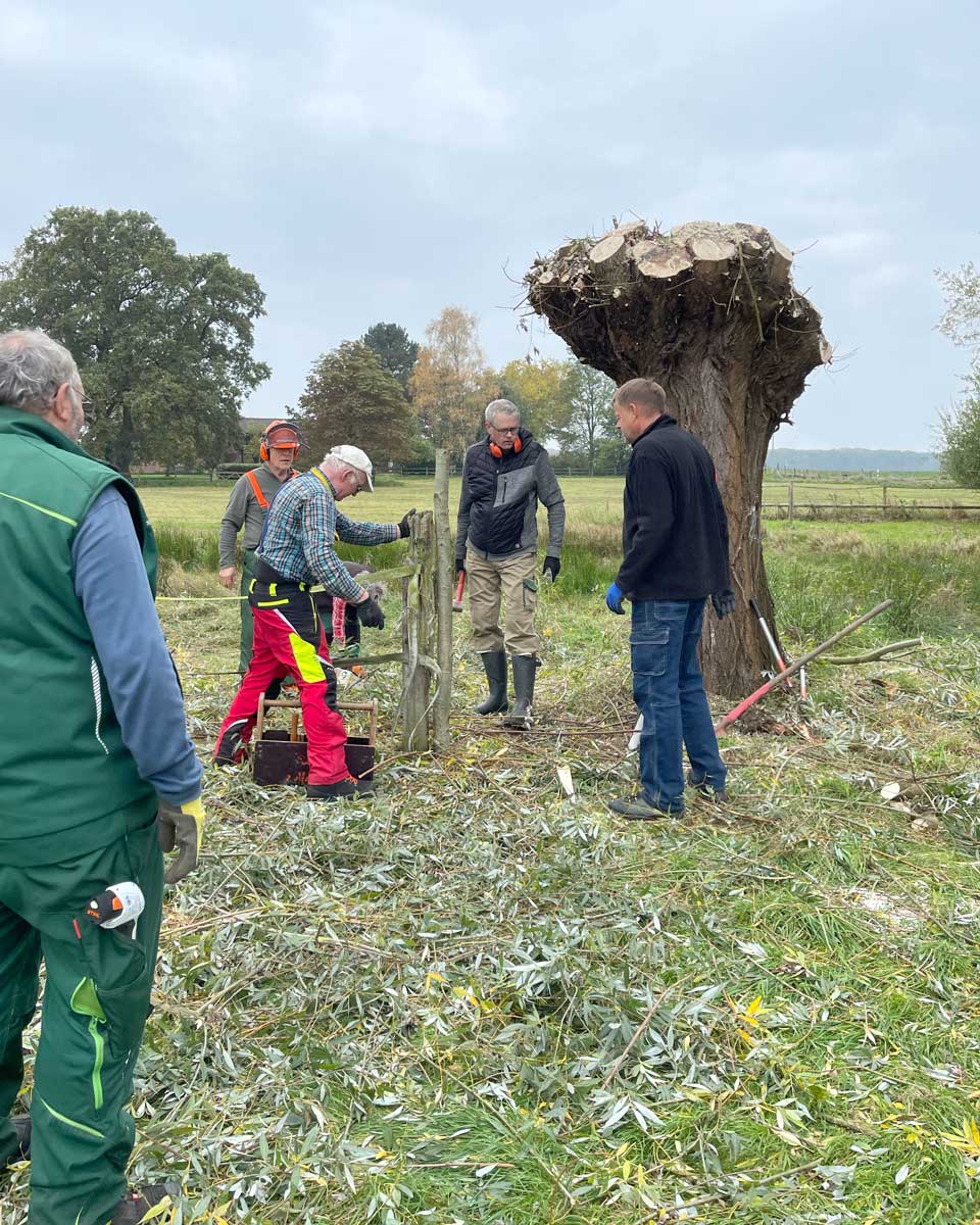 Die Weiden, die vom NABU in den achtziger Jahren gepflanzt wurden, haben mittlerweile eine stattliche Größe erreicht und müssen zum langfristigen Erhalt regelmäßig geschneitelt werden. Der Grünschnitt wurde mit dem Traktor auf einen nahegelegenen Abfuhrplatz für die Mags zur Abfuhr bereitgelegt.
