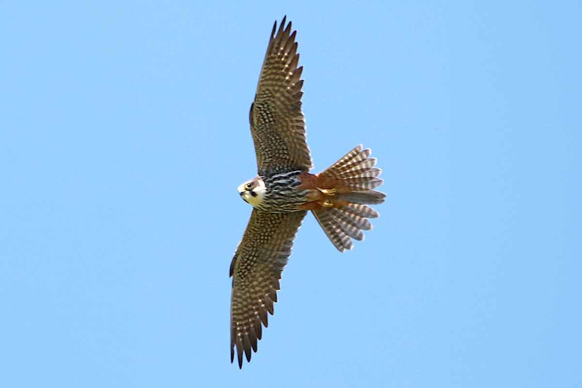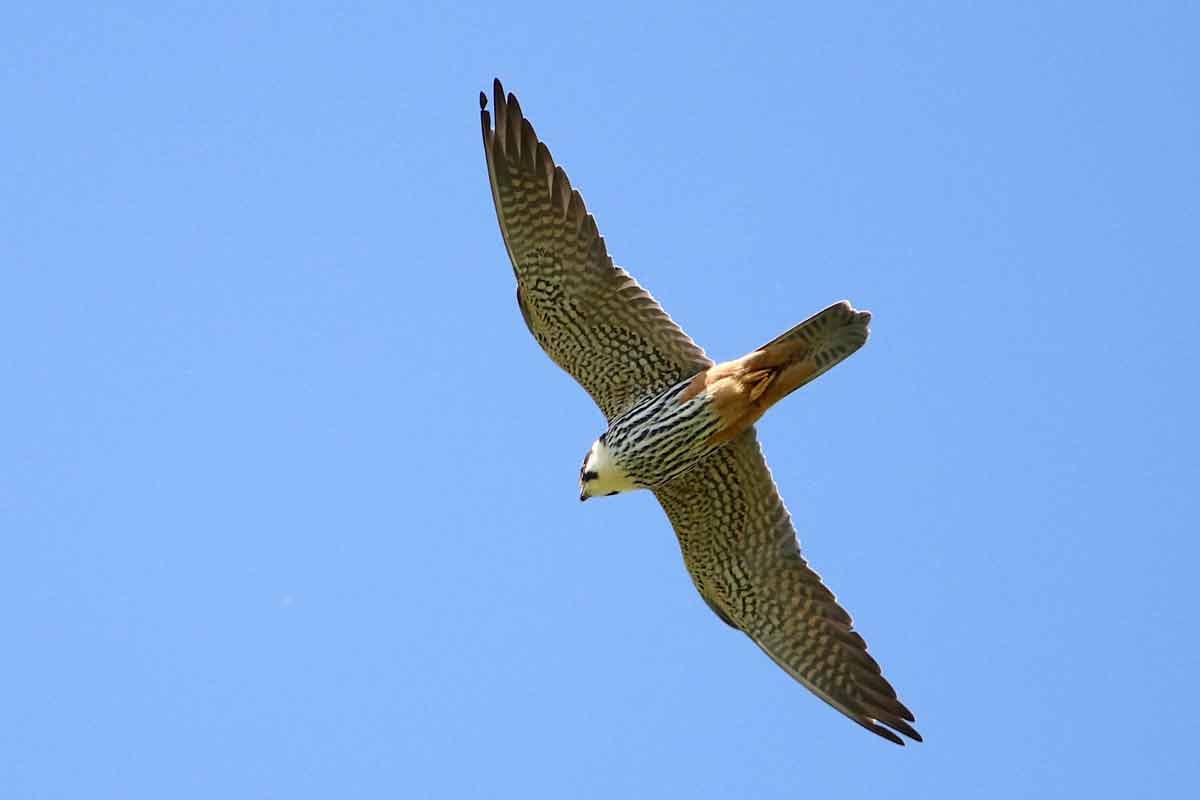 Der etwa taubengroße Baumfalke, früher bei uns auch Lerchenfalke genannt, ist ein rasanter und sehr geschickter Greifvogel, der fast ausschließlich in der Luft jagt. Im blitzartigen Flug über freiem Gelände erbeutet er nicht nur kleine Vögel, sondern auch größere Fluginsekten.
