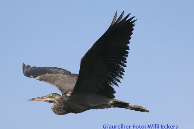 | Flugbild | Im Flug erkennt man den S-förmigen Hals und die weit nach hinten gestreckten Beine. |