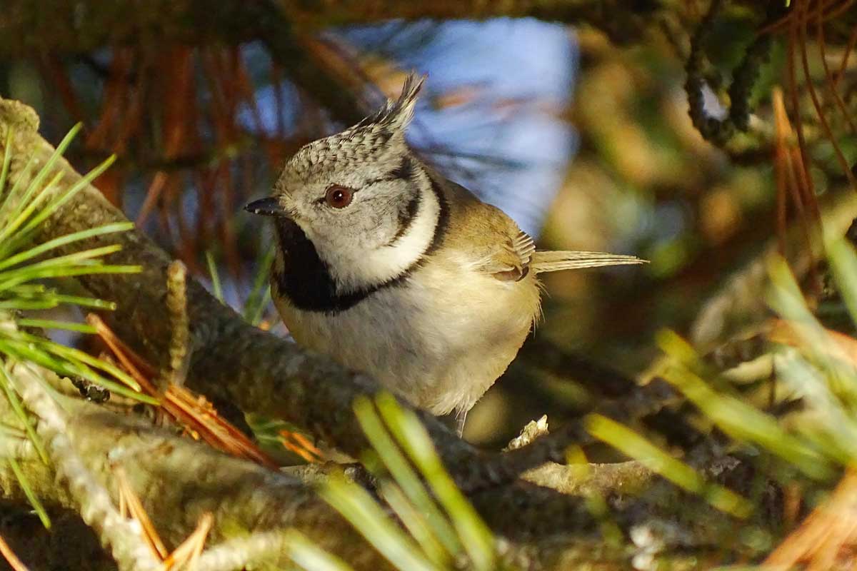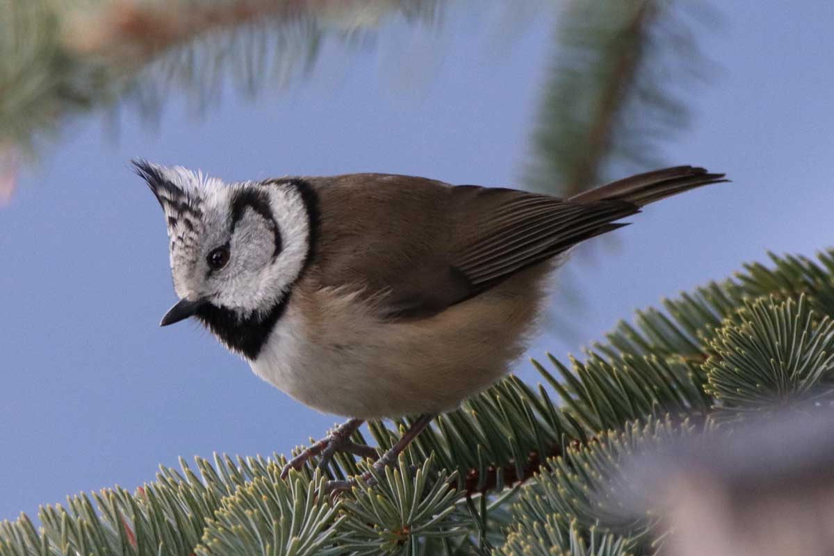 Die etwa blaumeisengroße Haubenmeise ist aufgrund ihrer spitzen Federhaube ein fast unverwechselbares, zierliches Vögelchen. Sie ist ein typischer Bewohner des Nadelwaldes. Hin und wieder ist sie auch in Parks und auf Friedhöfen mit Nadelholzbeständen anzutreffen; meistens paarweise.
